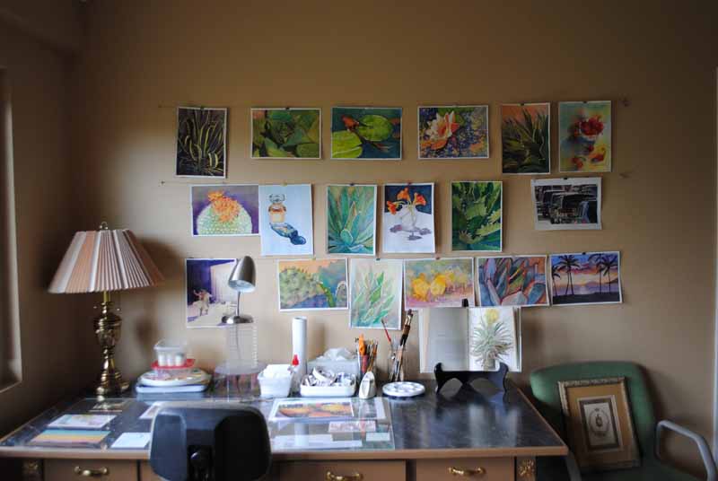 Last month I visited the beautiful garden of Debra Lee Baldwin, and while inside her home I couldn’t help sneaking a photo of her charming desk. It’s at this sweet little corner where she creates her stunning succulent and cactus watercolor paintings.