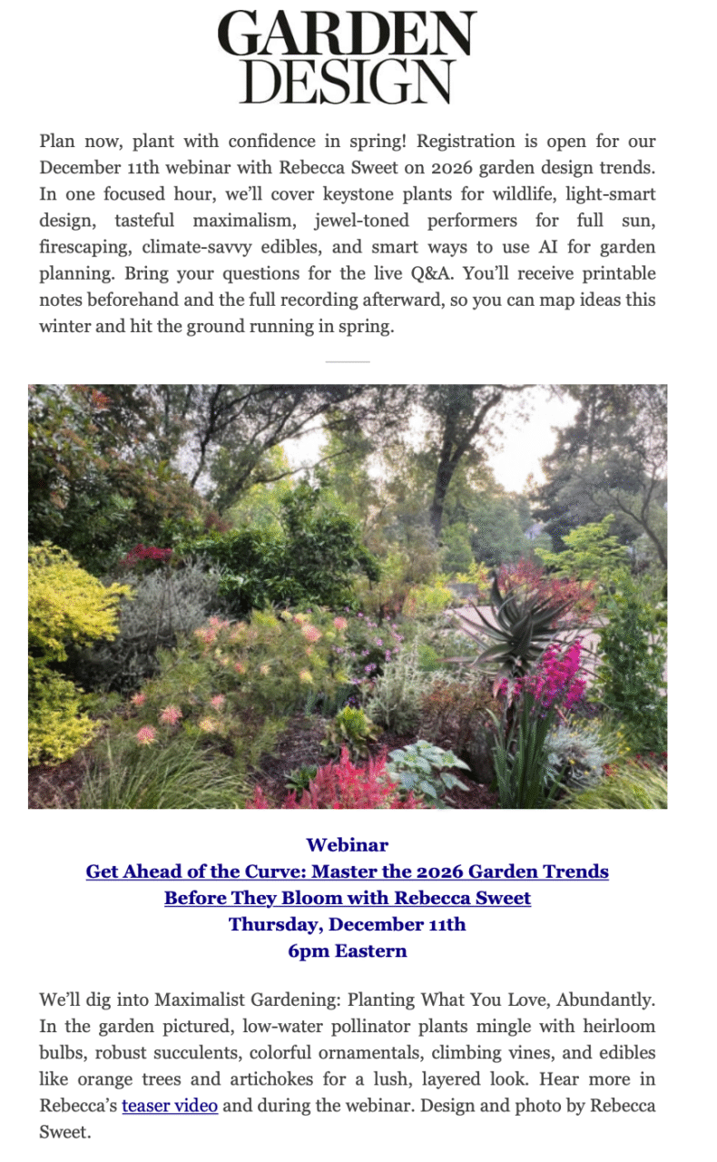 On December 11 at 3:00 PST, I’ll be discussing 2025 Trends in Gardening and it’s going to be a GOOD one (if I do say so, myself!)