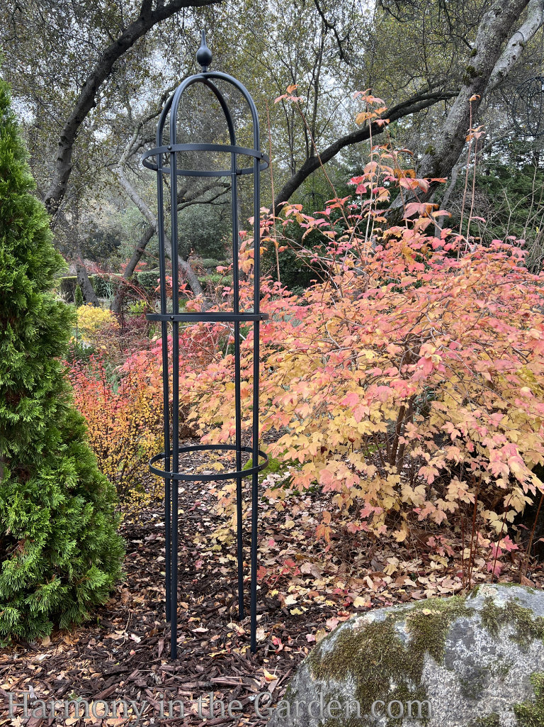 I have the Classic Rose Obelisk, medium size, which is an impressive 6’7” tall even after the legs are sunk 11-inches into the ground!  There are even larger sizes available which are almost 9’ tall – a next-to-impossible size to find.
